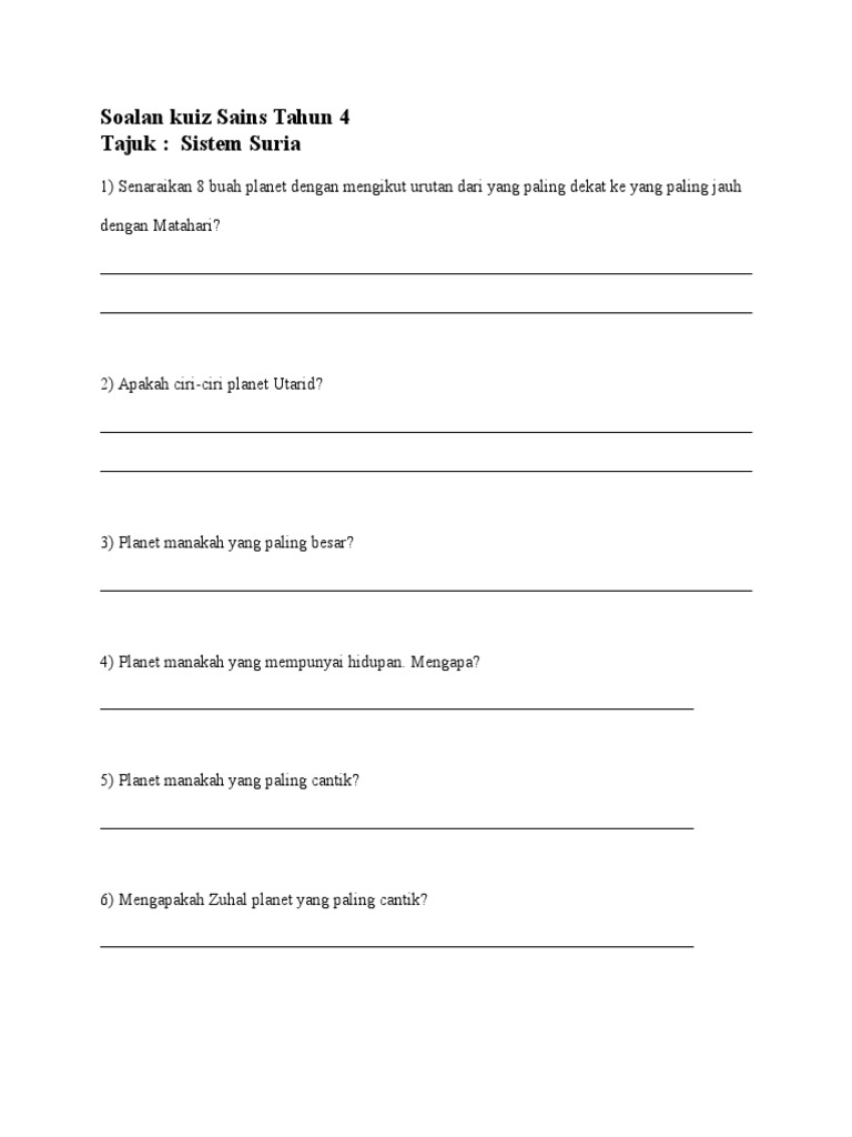 Soalan Sains Tahun 4 Mengikut Topik. · kertas peperiksaan ini adalah sains untuk murid darjah 4 mengikut kurikulum standard sekolah rendah (kssr). Sesuai digunakan untuk ulangkaji dan dilekatkan di dalam kelas.